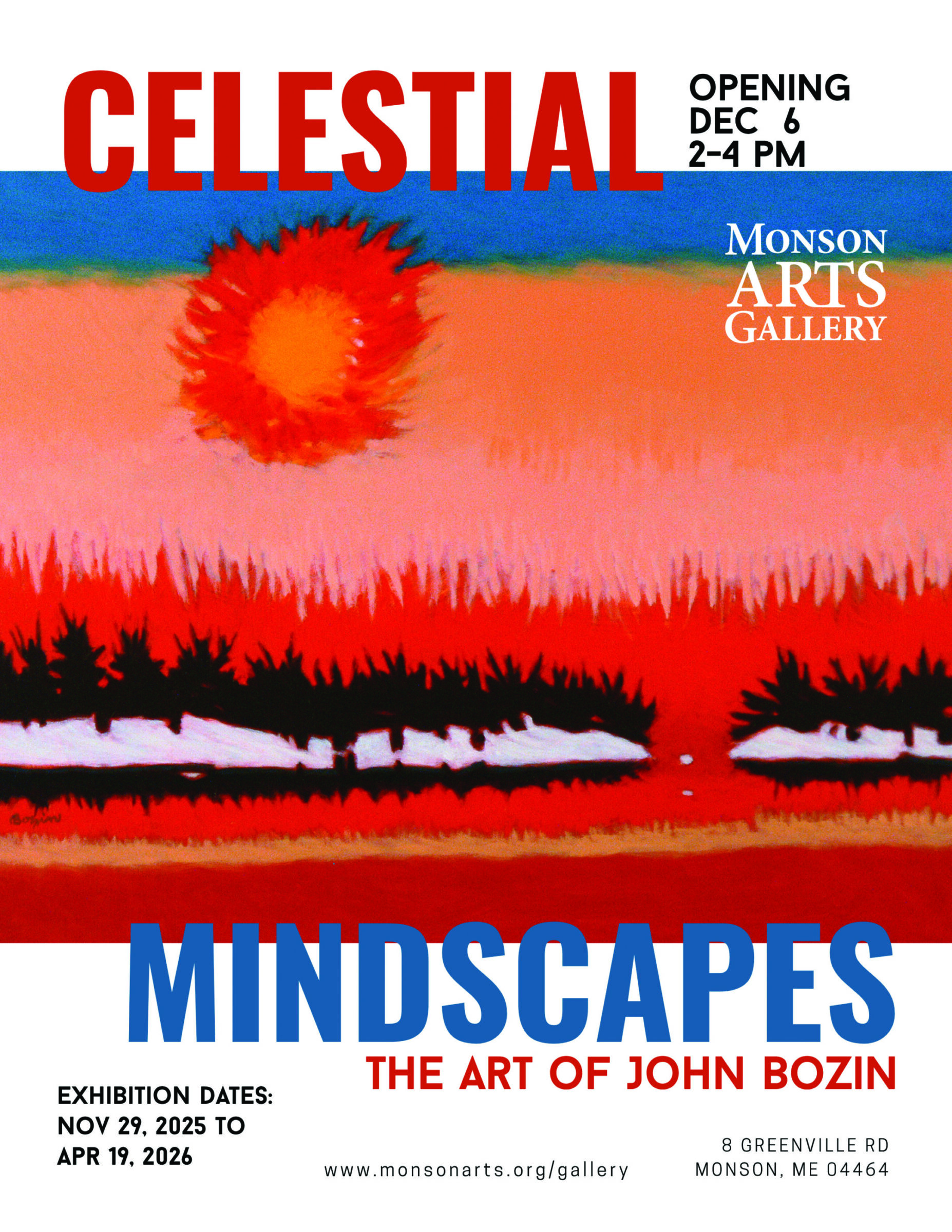 The Monson Arts Gallery celebrates the creative heritage of Maine by hosting a wide variety of exhibitions featuring local artists, past and present. Presenting 3 to 4 shows a year, the gallery is a space to explore the artistic works connected to Monson Arts programs including local high schools and Maine colleges as well as featured professional artists like Berenice Abbott and Alan Bray. Additionally, the gallery has featured Monson historical shows and Maine Highland open calls as well as traditional Wabanaki indigenous art.