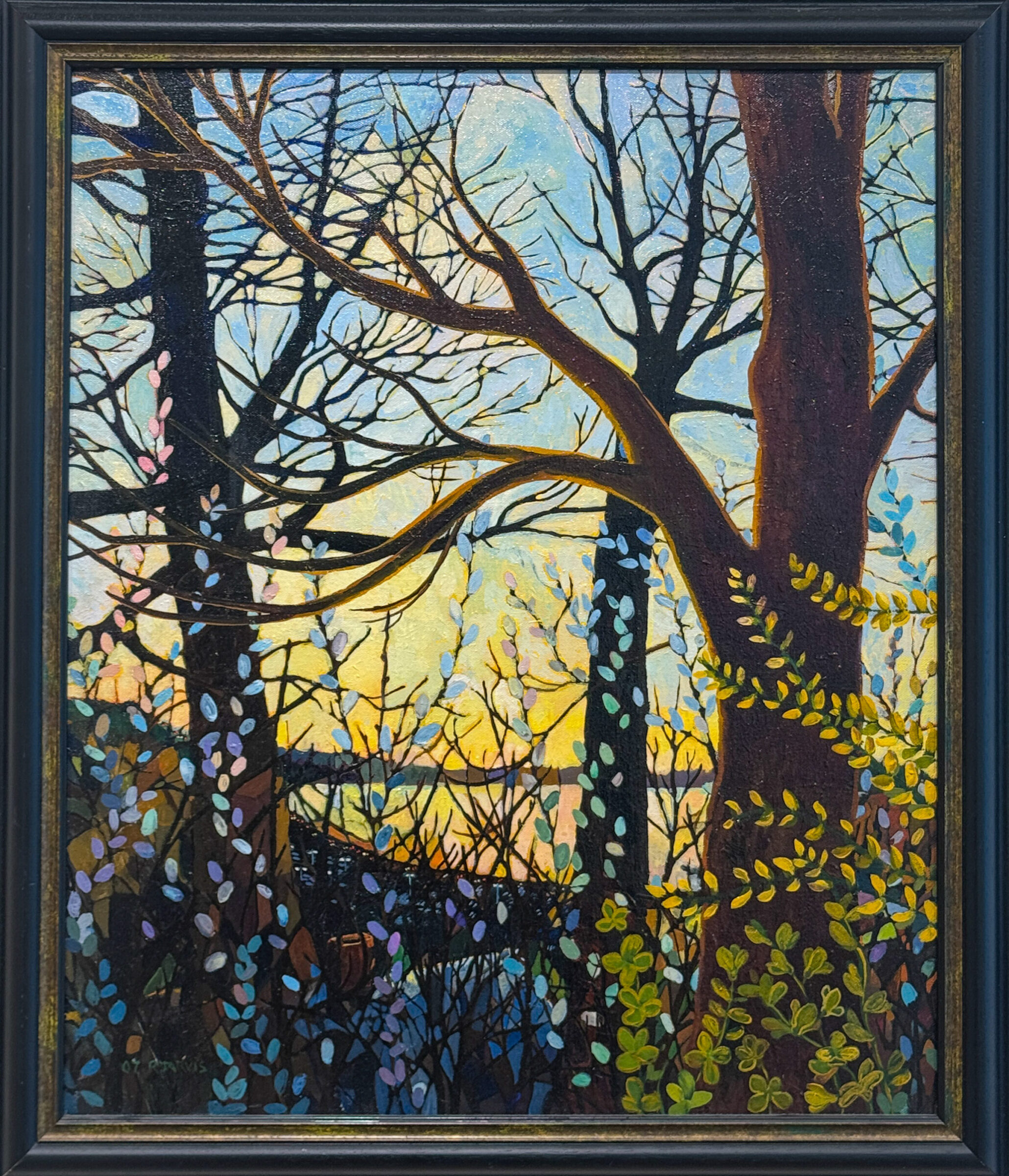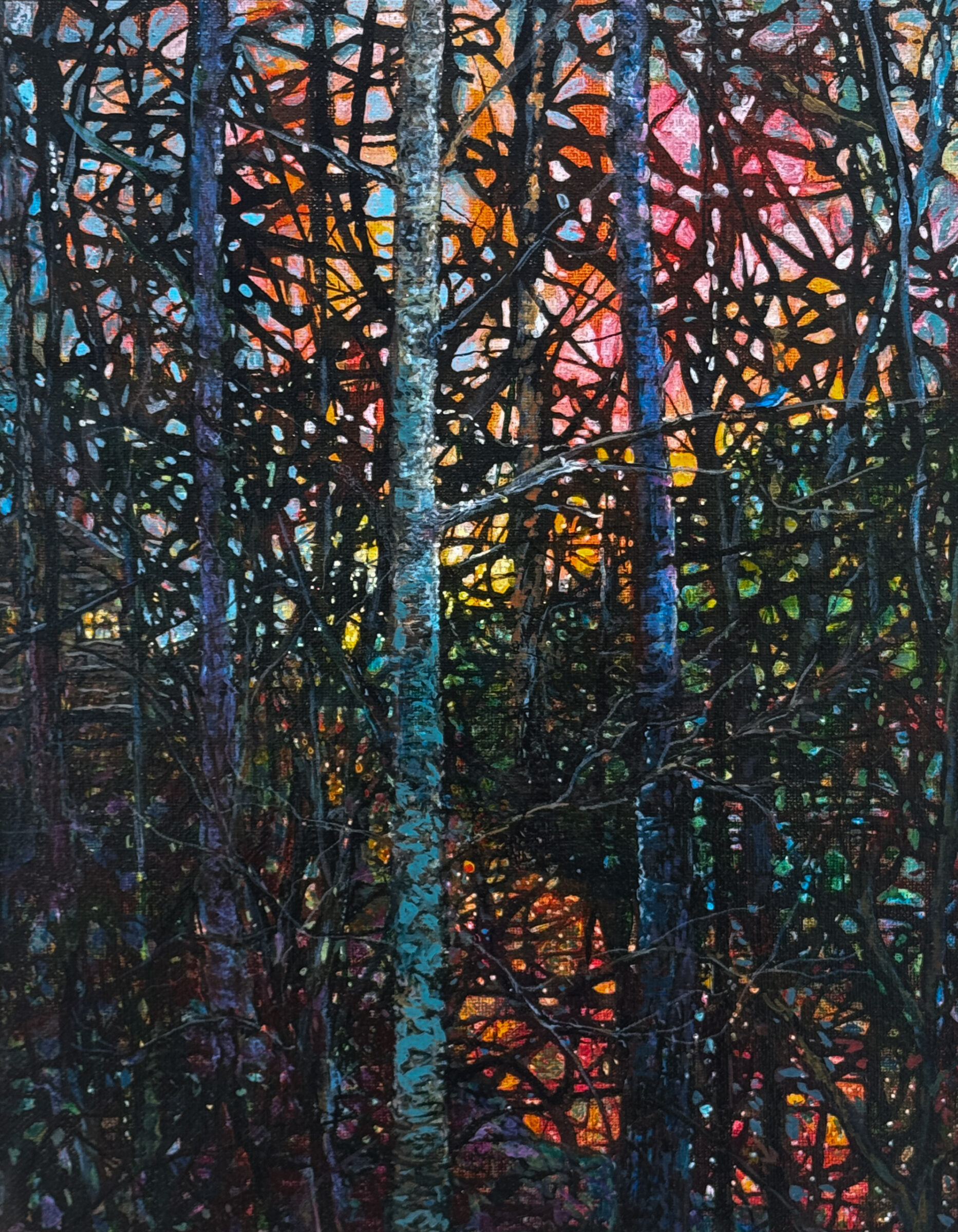 Roberta’s work is complex, vibrant, and varied in subject matter; she skillfully walks the line between abstract and representational depictions of trees, landscapes, animals, and people. The anchor subject of this exhibition is trees, painted in her unique style. When asked about her series, These Complicated Woods, Roberta said that the busyness of the landscapes obscured by trees, branches, and leaves and being unable to distinguish one thing from another brings to mind how much of life is obscured, often hidden and private. The woods represent these complexities and secrets. They are a reflection of how she perceives the inconspicuous culture of Central Maine.