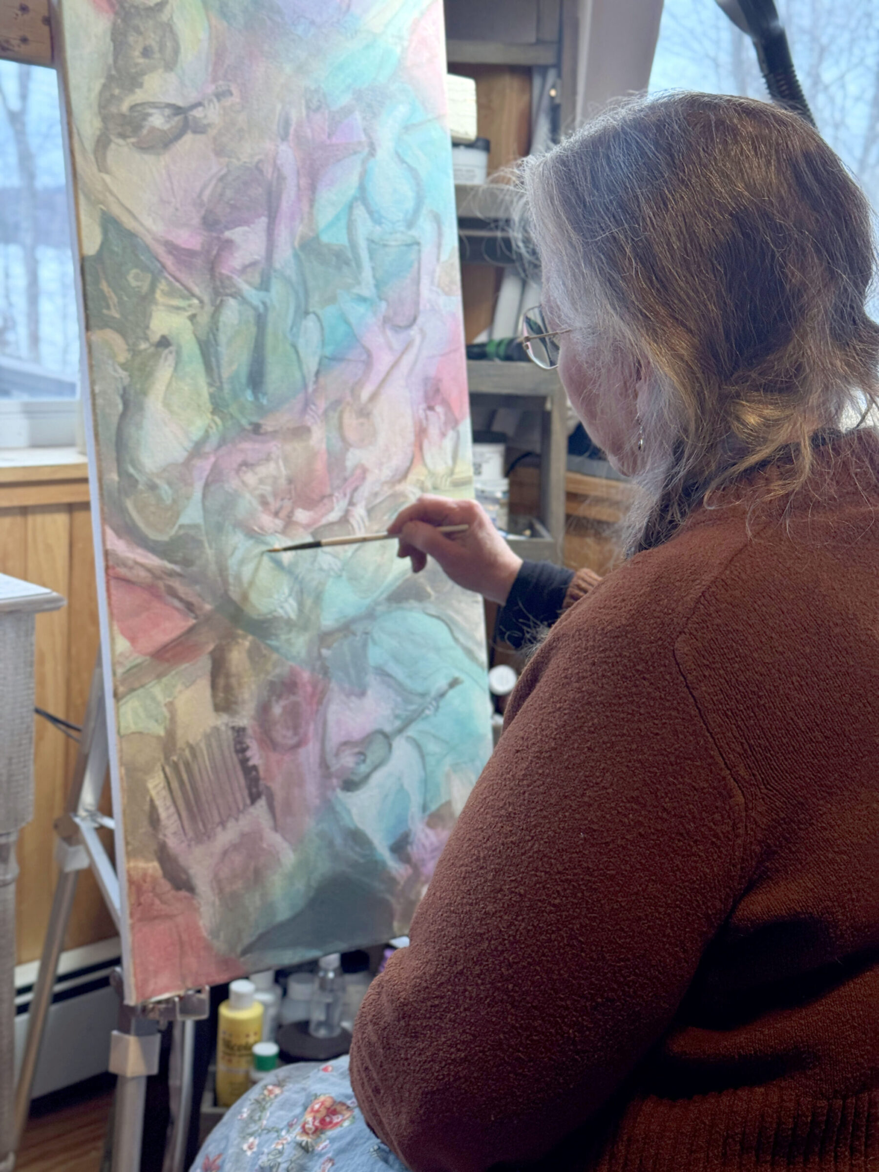 Roberta feels the last ten years of living in Monson full-time have been the most productive of her life regarding her art. Living a simpler life has allowed her the freedom to create whenever she wants. She said that, in some ways, it feels like she’s been on a 10-year residency, having the time and space to follow what inspires her. Roberta’s work shows a depth of expression that is only gained through experience in life and art. Her career spans 45 years of steady painting and sales. We hope that you will take the time to see her solo show and appreciate our “resident artist.”