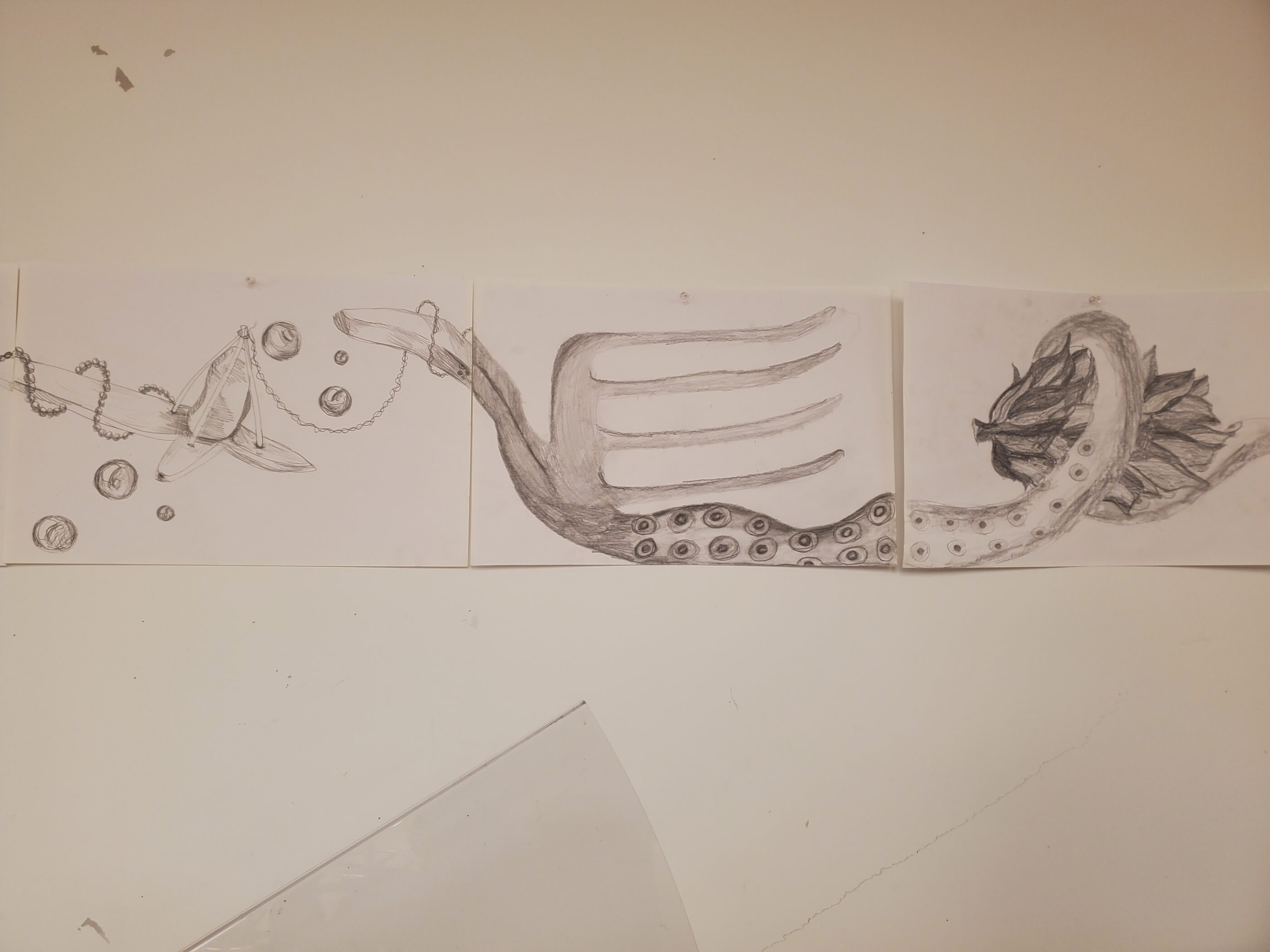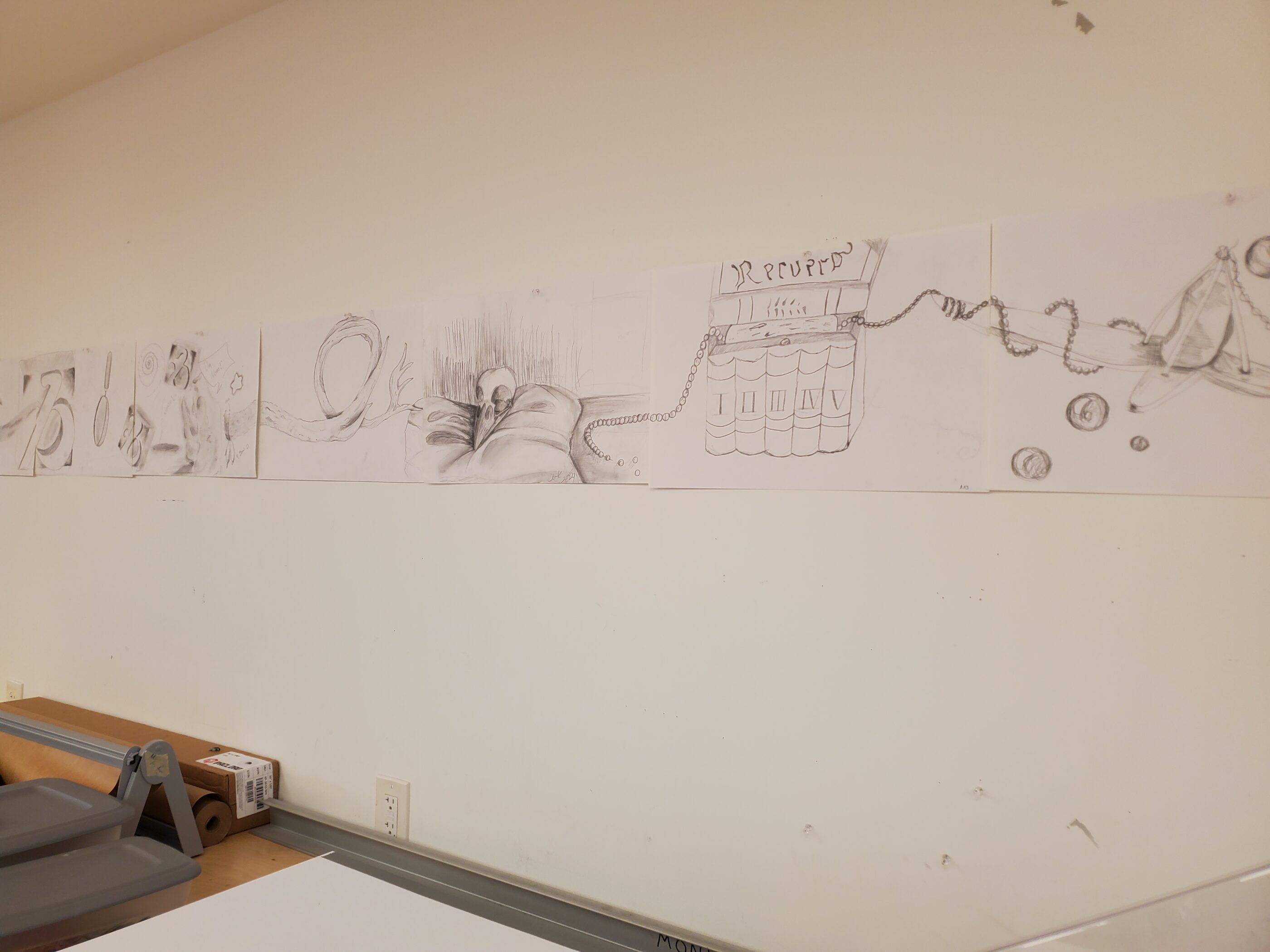 Class started with a large collaborative drawing, pencils in hands, working off each other by connecting individual objects to create one long drawing which they posted on the wall in the Moore Building Studio where they then related their experience in taking on the project. Transitioning, students started to put together gesso panels, setting the stage for their future paintings to come in the next few sessions. Additionally, Alan went over the general outline of what to expect for the class in the coming year and also talked about getting into sculpture and model making, something many of the students haven’t had much experience with as young artists. Artists also visited the Gascoine Gallery to view “Tree Talk”, an exhibition that highlights a love of trees in various forms of art where they spoke with curator Jemma Gascoine about the show.